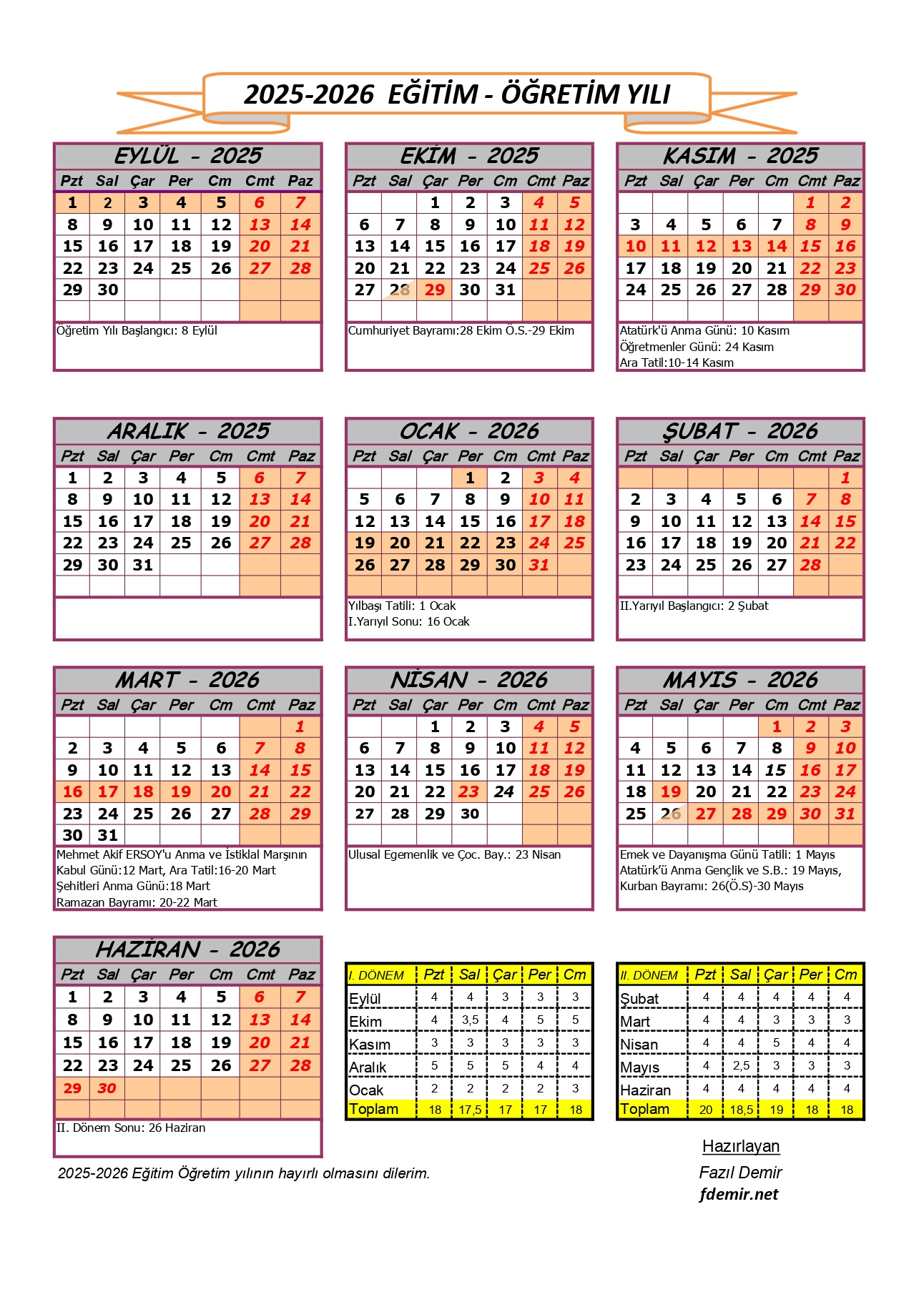 2025-2026 eğitim öğretim yılı için okullar, öğretmenler için yıllık çalışma takvimi. PDF ve Resim dosyası olarak indirilebilir. İndirip özgürce kullanabilir ve paylaşabilirsiniz.
